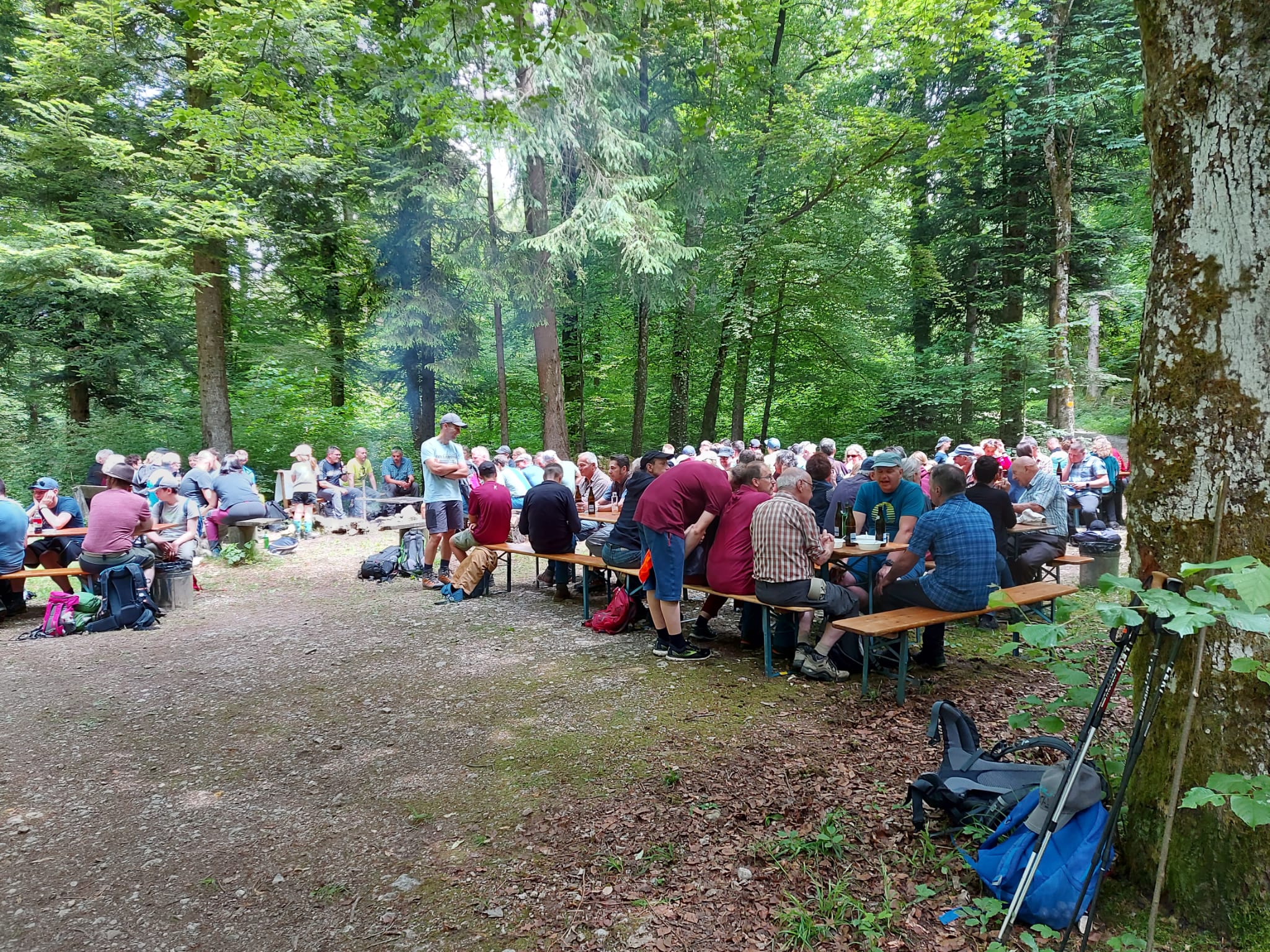 Wir konnten am morgen bei der Grossen Tour etwa 130 Teilnehmer: innen begrüssen. Die Route war anspruchsvoll, aber sehr schön gewählt. Vom Gemeinde Haus führte der Weg einmal im den Birgel zur Schlossgumpi dort durften bei einem Apero die Batterien neu geladen werden. Nach dem Apero ging es via Chemieflueh, den Wilden Löcher und dem Polen-Wägli zum Casino, dort gab es dann den wohlverdienten Mittagshalt. Der Schlussabschnitt führte über den Stierbodenweg und der Gritt-Hütte zum Ziel ins Schützenhaus. Kurz vor der Gritt-Hütte kam es zur Verschmelzung der grossen und kleinen Tour, diese ist 13.30Uhr gestartet. Die kleine Tour führt vom Gemeindehaus ins Oberdorf, weiter zum Reservoir und über den Stierboden zur Gritt-Hütte, von da dann via Scheibenstand zum Schützenhaus. Mit dem Zusammentreffen der beiden Touren, dürften wir im Schützenhaus ca. 250 Wander: innen begrüssen. Die Musik Brass Band Konkordia Büsserach hiess die Wander: innen mit ihrer musikalischen Unterhaltung willkommen. Auch der Gemeinde-Präsident Josef Christ sprach zu den Anwesenden und berichtete über das Geschehen im Dorf. Nach dem Feierlichen Akt wurde bei einem kühlen Getränk, einem feinen Kuchen oder einem Waldfest noch eifrig diskutiert, gelacht oder auf den schönen Tag angestossen.