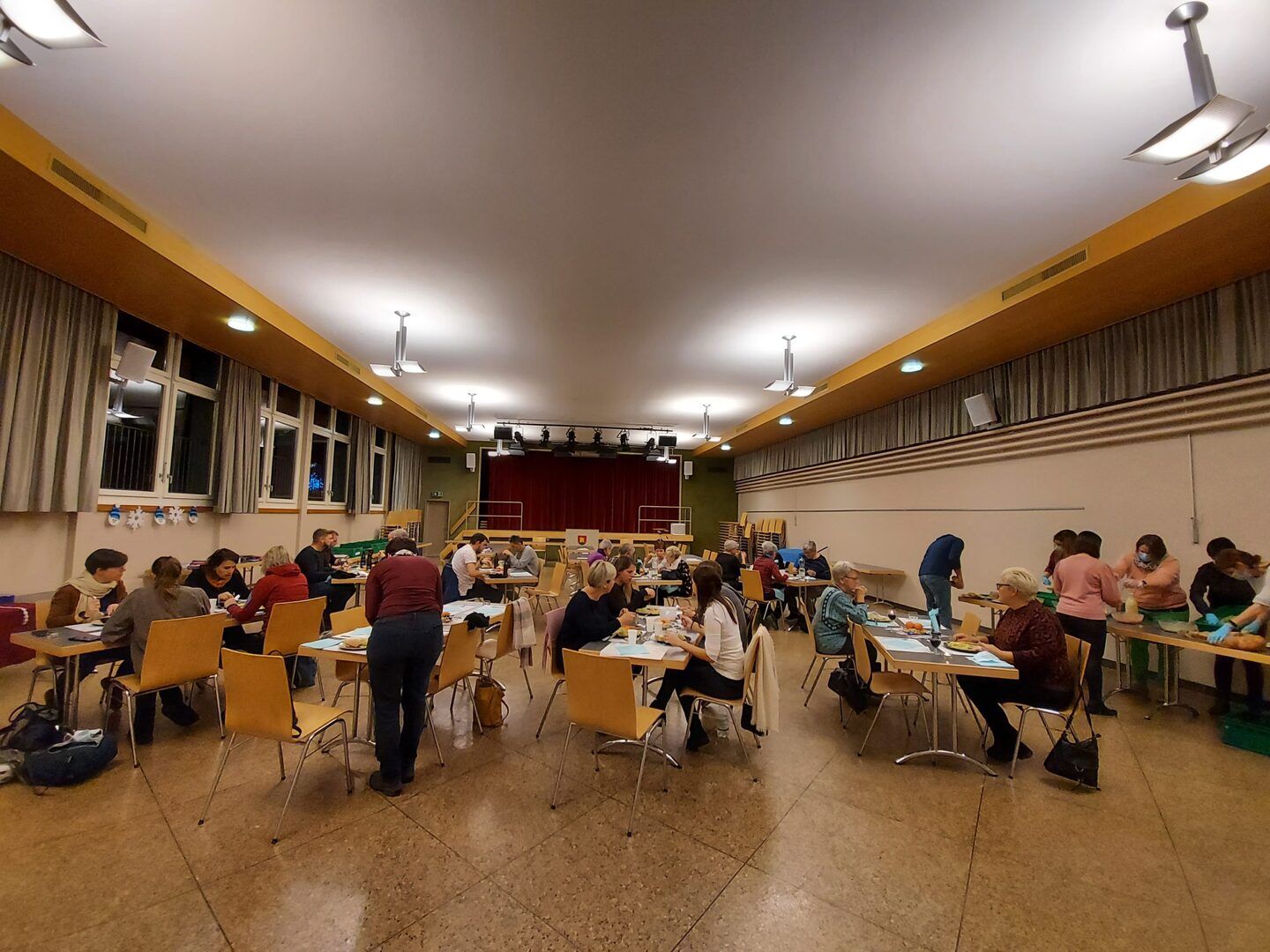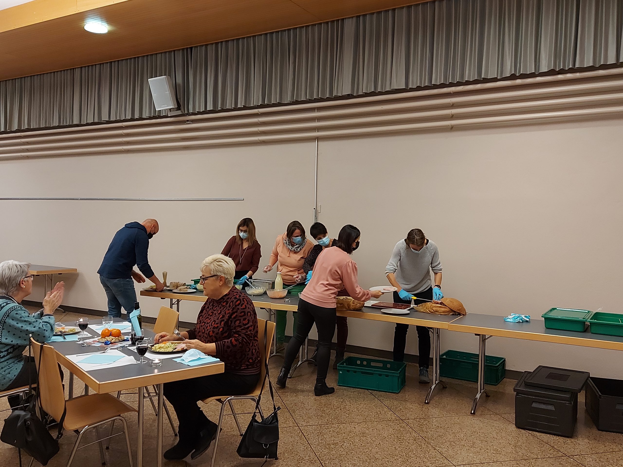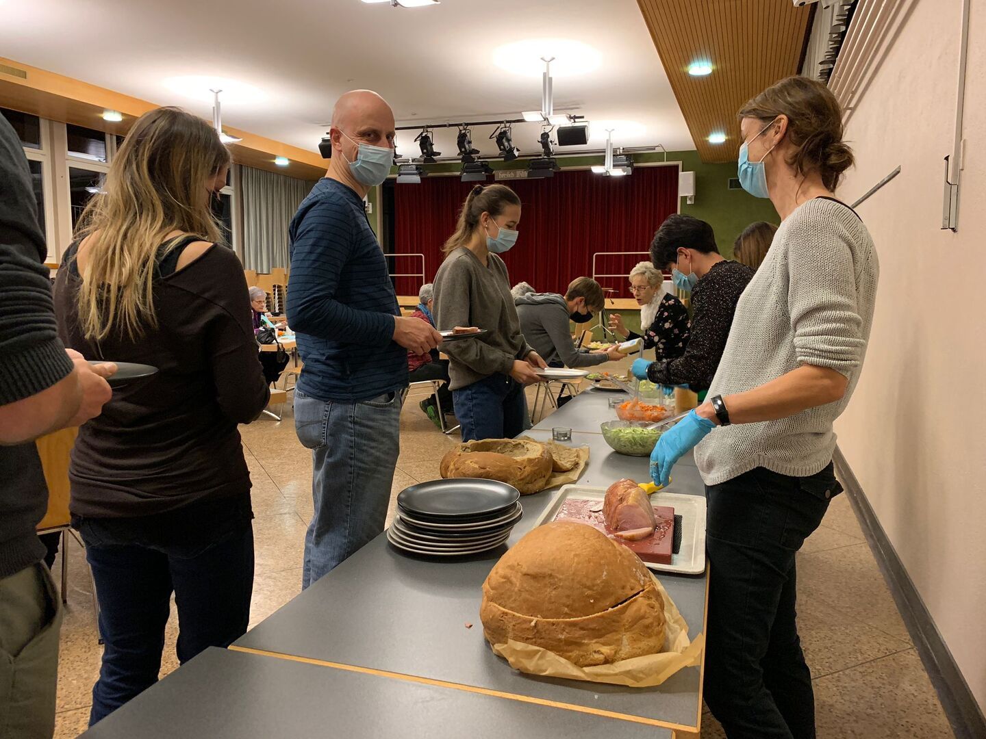 Pünktlich wurde das Schinkli im Teig und die vielen Salate vom Party Service geliefert. Der feine Geruch lockte alle umgehend in die richtige Richtung und schon kurze Zeit später wurde im winterlich geschmückten Konzertsaal die knurrenden Mägen zur Stärkung fürs Spiel gefüllt.
