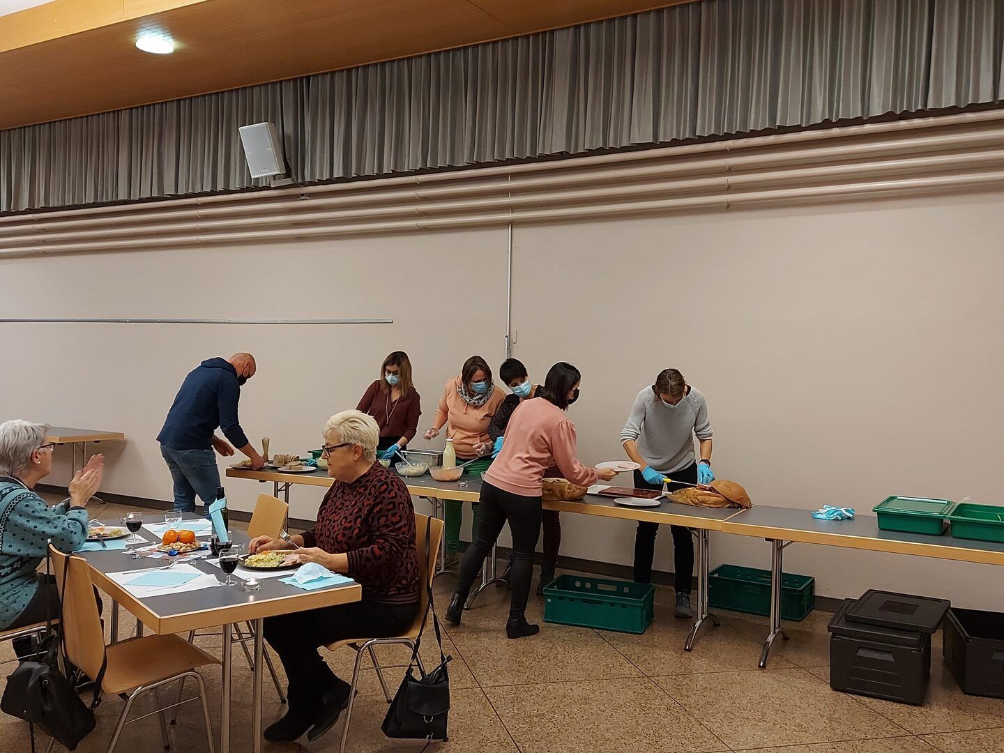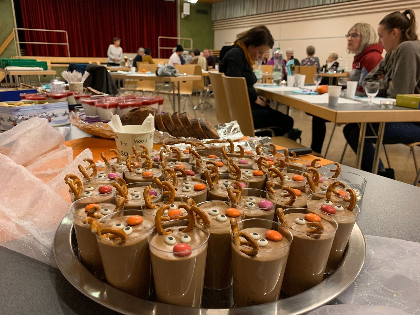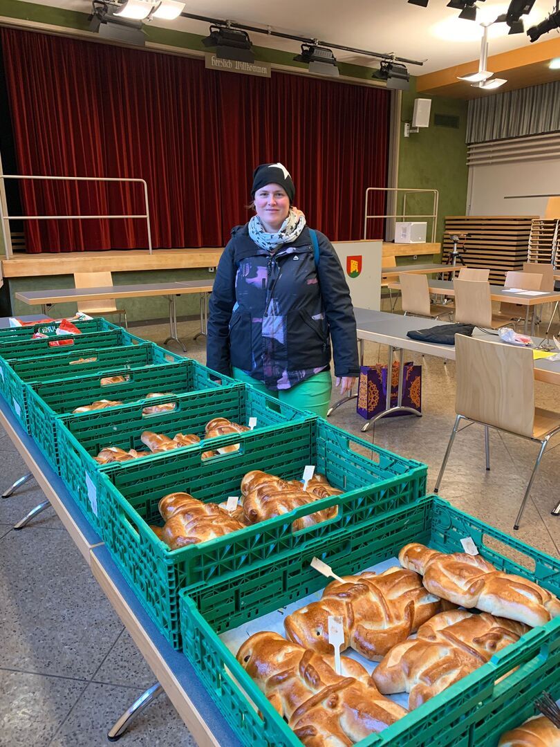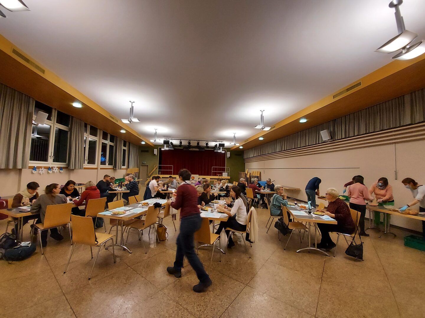 Pünktlich wurde das Schinkli im Teig und die vielen Salate vom Party Service geliefert. Der feine Geruch lockte alle umgehend in die richtige Richtung und schon kurze Zeit später wurde im winterlich geschmückten Konzertsaal die knurrenden Mägen zur Stärkung fürs Spiel gefüllt.