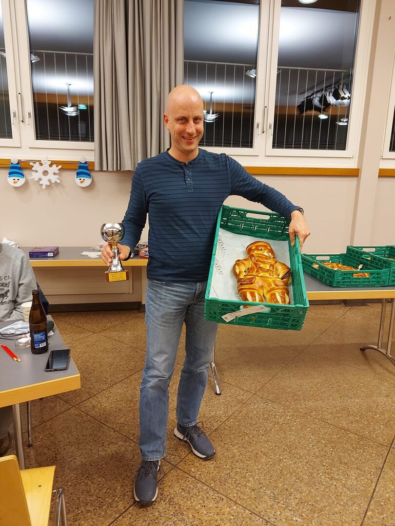 Daniela war bereit für die Rangverkündigung und begann bei Platz 16. Auf den Rängen 1 – 4 waren noch zwei Frauen und zwei Männer im Spiel, wird es ein Jasskönig oder eine Jasskönigin geben? Wird der Titelverteidiger den Pokal auch dieses Jahr mit nach Hause nehmen? Die Plätze 3 und 4 wurden von weiblichen Jassern belegt. Annette Caillet, Gratulation zum Bronzebänz. Für Gold und Silber standen zwei Herren bereit. Beide Ü40, beide ehemalige Jasskönige und beide haben dieselbe Hausnummer. Bis zur letzten Runde führte der Titelverteidiger den Bänzenjass an, doch mit dem letzten Spiel überholte ihn der Verfolger mit nur 30 Punkten. Spannung bis zur letzten Minute. Ralf Jeker holte sich den silbernen Bänz und musste den Pokal nach der Doppeltitelverteidigung abgeben. Glückwunsch zum zweiten Platz, Ralf. Tatarata… Der Sieger durfte einen grossen Bänz und den Wanderpokal entgegennehmen und freute sich sehr. Herzlichen Glückwunsch Andi Giger zum Jasskönig 2021.